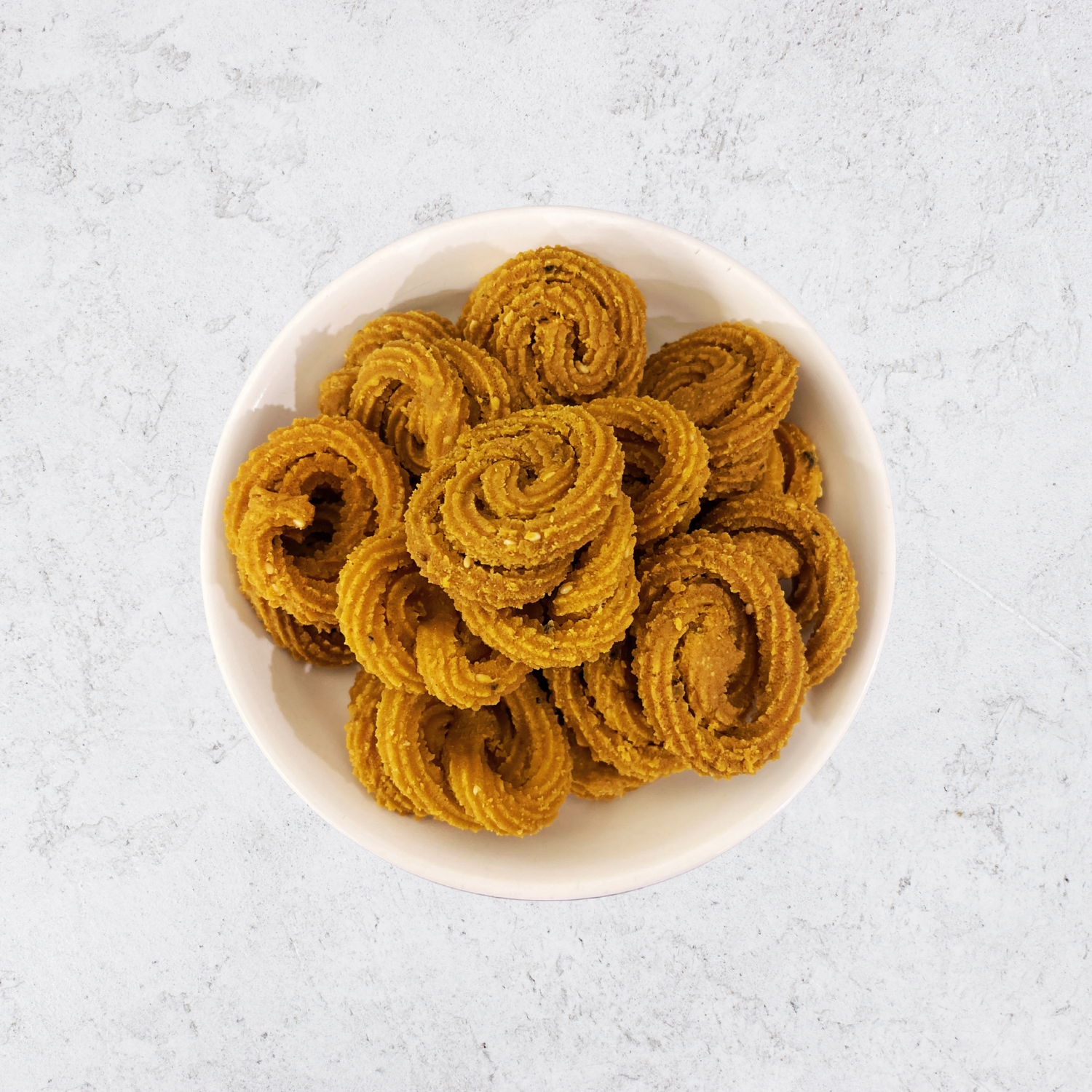 Miniature spirals of deep-fried dough made with rice and lentil flours?crunchy and mildly spiced.